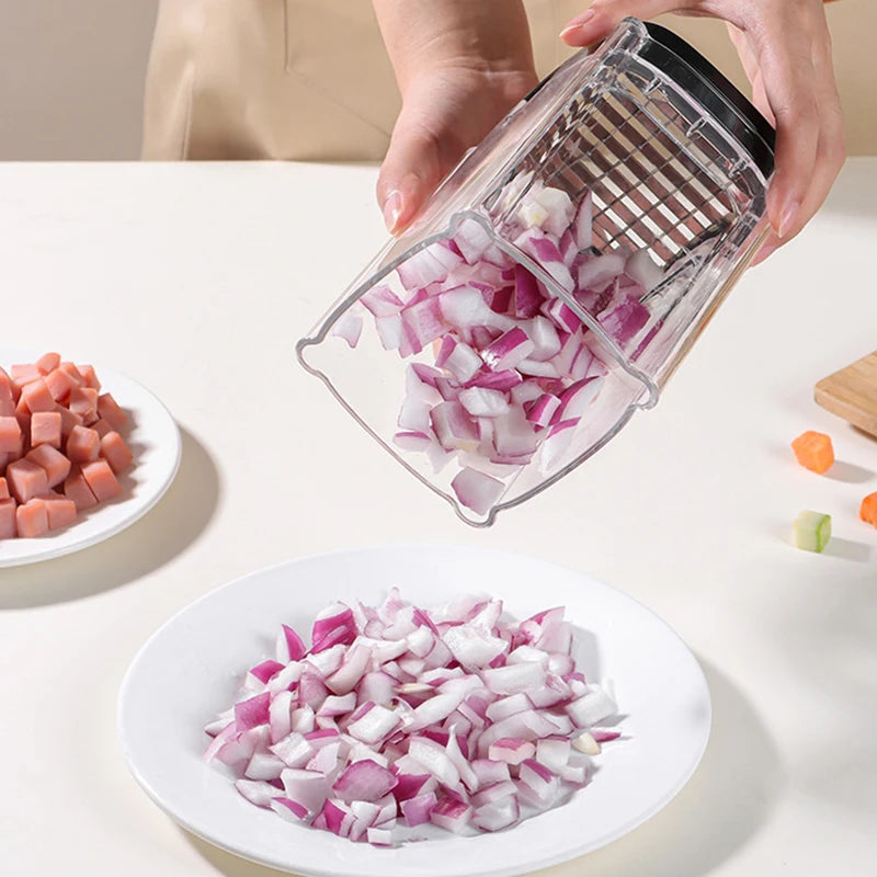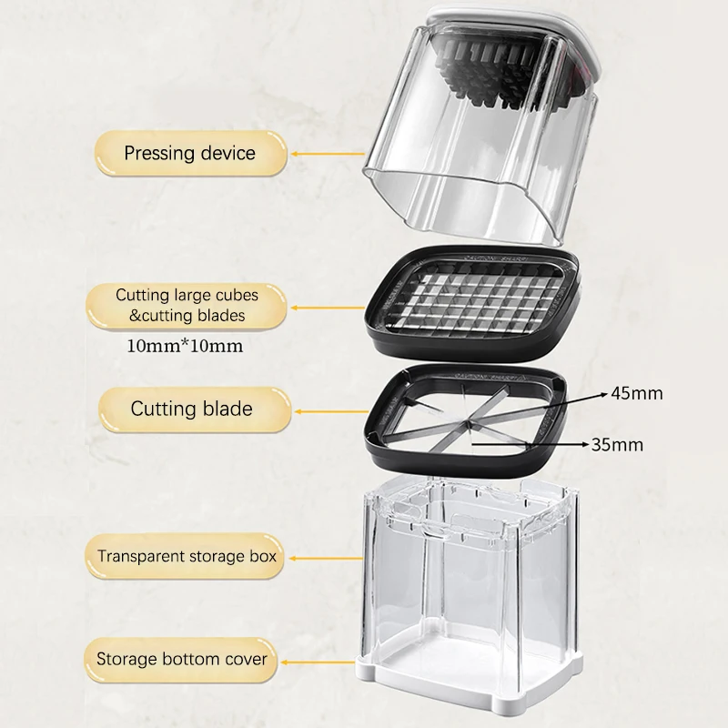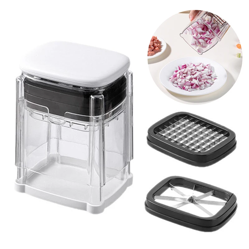 1,DUALBLADE VERSATILITY:Two highquality SS304 blades let you switch instantly between an 8wedge slicer (perfect for orange segments, apple wedges, kiwi fruit) and a 3/8″ dicer grid (ideal for classic French fries, diced onions, cubed potatoes).