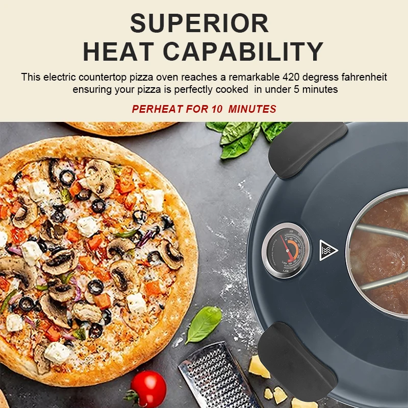 Dual heating elements reach 800℉ for crispy pizzas in 5 minutesTwin control knobs simplify temperature and time adjustmentsAnti-scald handles and non-slip feet ensure safe operationTransparent window lets you watch your pizza cook to perfectionRemovable ceramic stone and high temperature oilcloth for easy cleanupOverheat protection provides peace of mind during use