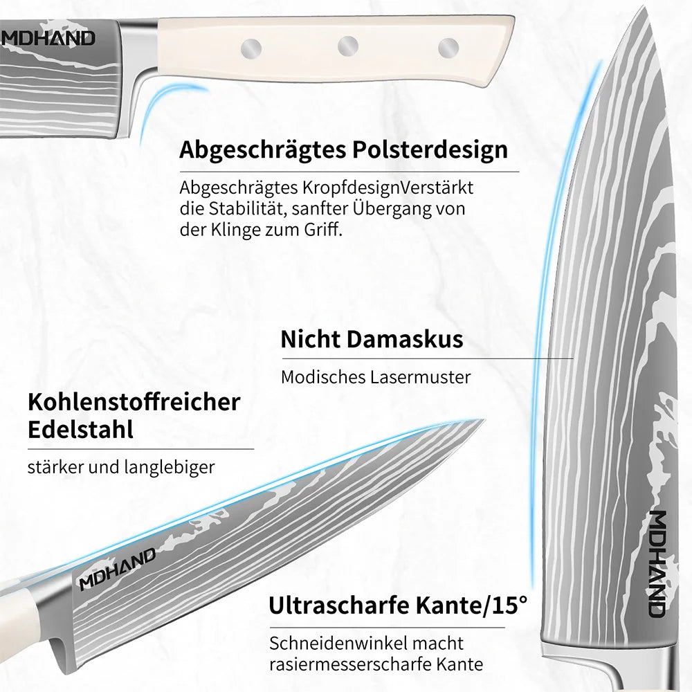 Knife Set Precise lasers are used to ensure each blade edge is at the optimal cutting angle for sharpness.It brings efficiency to save more time in everyday food preparation.