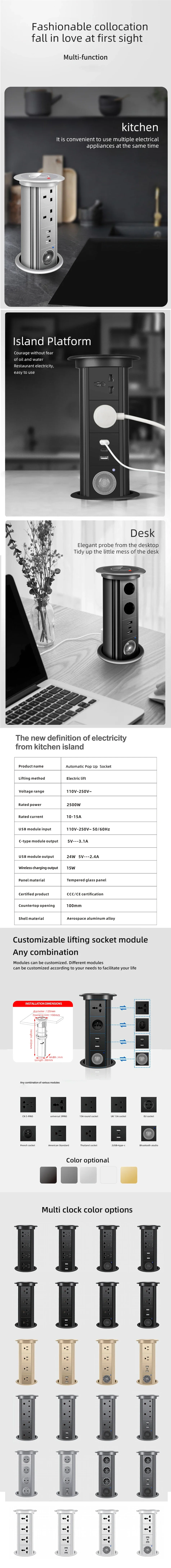 Motorized Pop up Tower Socket Wireless Charger Automatic Power Plug Desktop Worktop