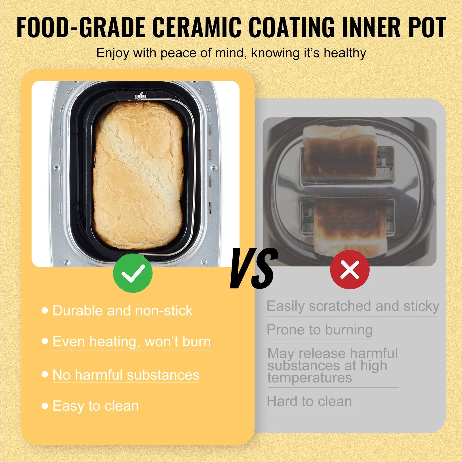 Food-Grade Ceramic Inner Pot: The inner pot of the bread maker machine is vital for your health and safety. We use a food-grade ceramic inner pot, resistant to high temperatures and free from releasing harmful substances. Durable, non-stick, with a coating that’s not easy to peel off, ensuring no burning even after prolonged use. The kneading blade is also made of food-grade Teflon material, safe and harmless. Each step in the baking process is a commitment to your health, ensuring each bite is safe and enjoyable.