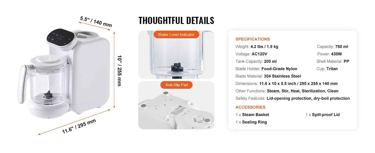 Safety Comes First: The baby food steamer incorporated overloading protection and anti-dry burning protection to prevent temperature control failures and dry burning in low-water conditions. Even if you get busy with your baby and forget to add water, our protection ensures no danger lurks.