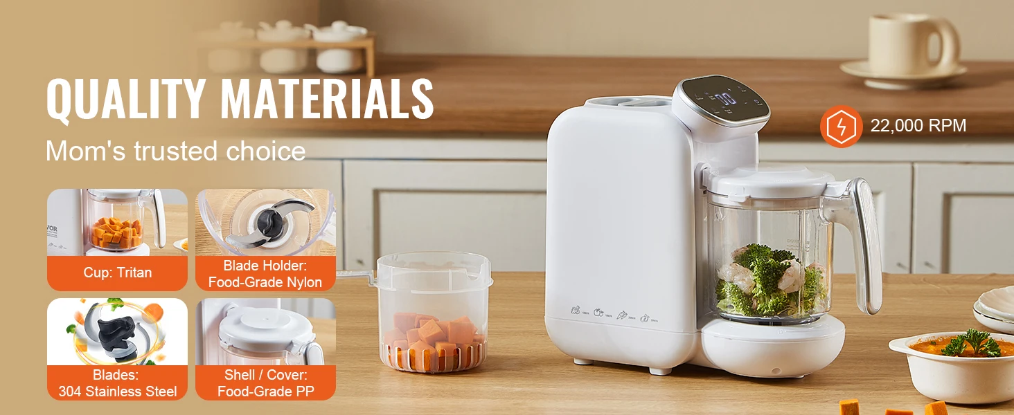 Protecting Baby's Safety: The baby food maker's container is made of Tritan, a durable and high-quality material, while its blade cutter is made of SUS304. This baby food processor is highly resistant to corrosion, rust, and high temperatures and boasts a sleek surface that keeps food debris from sticking, making cleaning and maintenance a breeze. You can rest assured that its strong stability ensures the safe handling of all your ingredients.